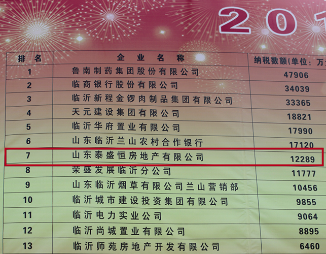 近日,從蘭山區(qū)統(tǒng)計局公布的統(tǒng)計數(shù)據(jù)顯示,山東泰盛恒房地產有限公司以12289萬元的納稅額榮登蘭山區(qū)2014年度納稅千萬以上企業(yè)第7名。